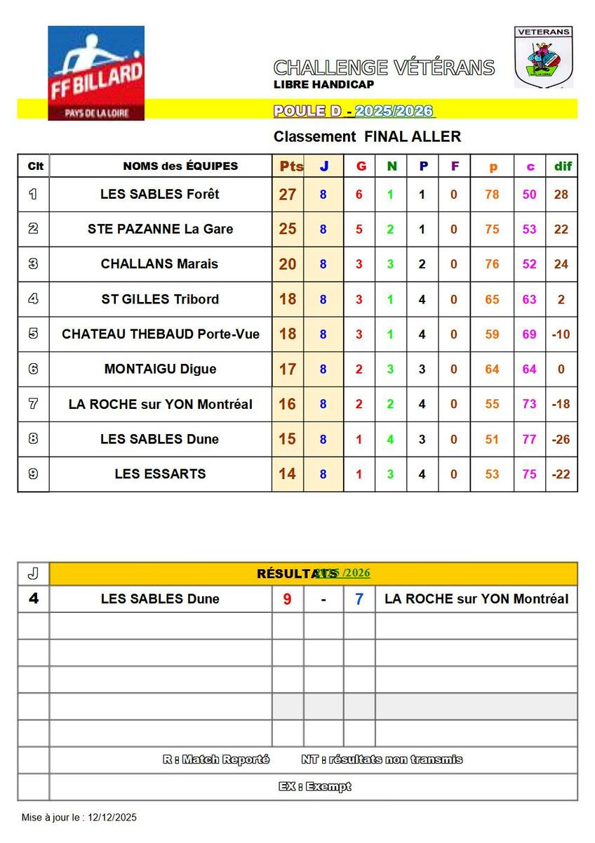 23/11/2025 - Résultats journée 8. Poule B, C, D. Championnat vétérans libre
